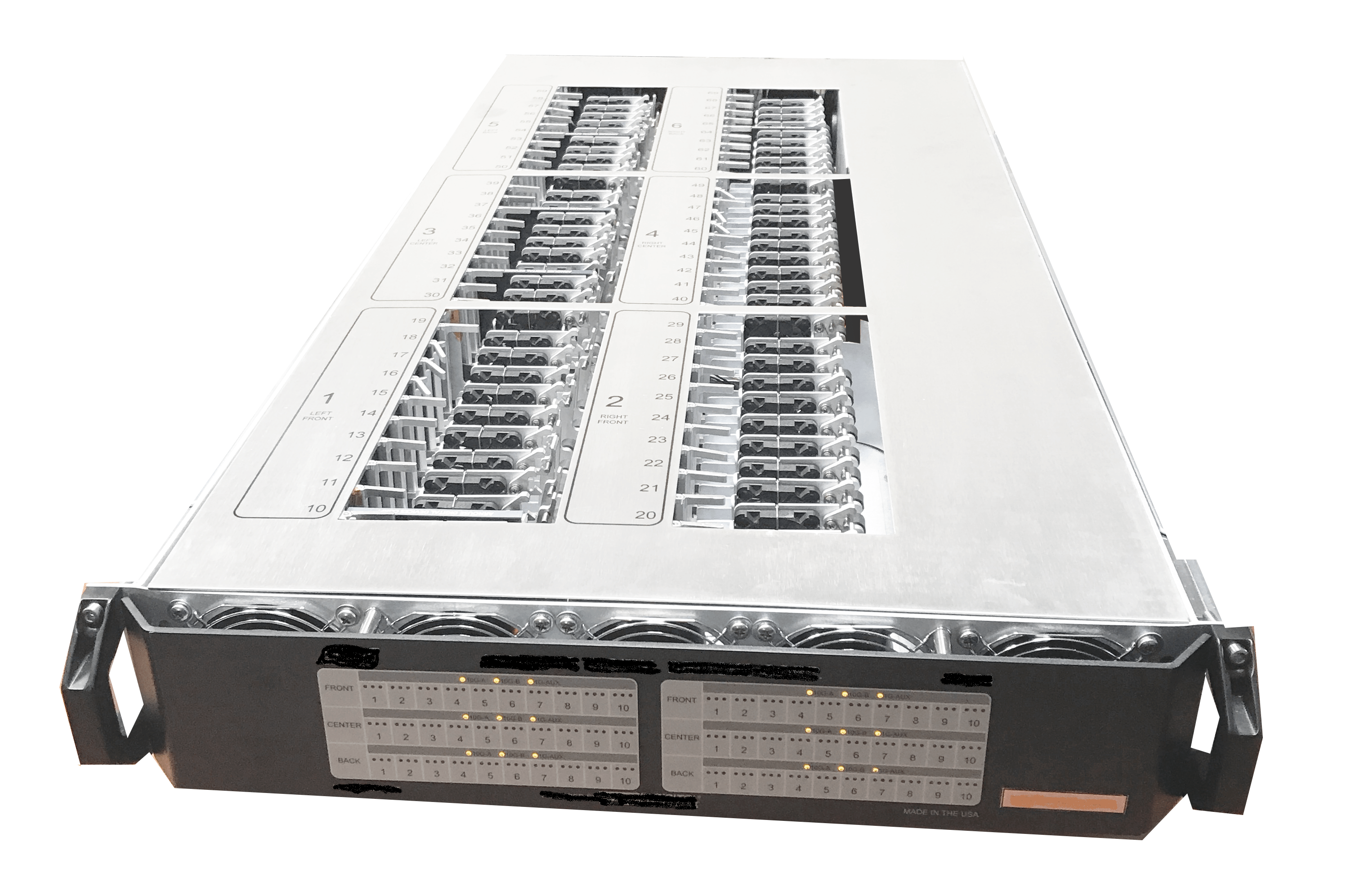 The HPC (High Performance Cluster) contains 26 2U tray chassis. The tray comes as a 2U sized drawer, which extends out of the rack 36” to expose the entire drawer. The tray can be operated in a hot or cold aisle. The tray is composed of 6 modules, each module comes with 10 card slots (cards sold separately), and (3) Gigabit NICs. All 30 Gigabit NICs are then connected to a shared managed Ethernet switch with 2 SFP+ 10 Gb interconnects and an auxiliary 1 Gb connection providing each tray with 120 Gb throughput.